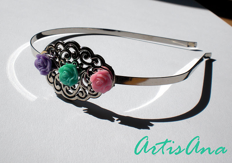 Bandolete vintage com cabochons lilás, verde-água e rosa.
